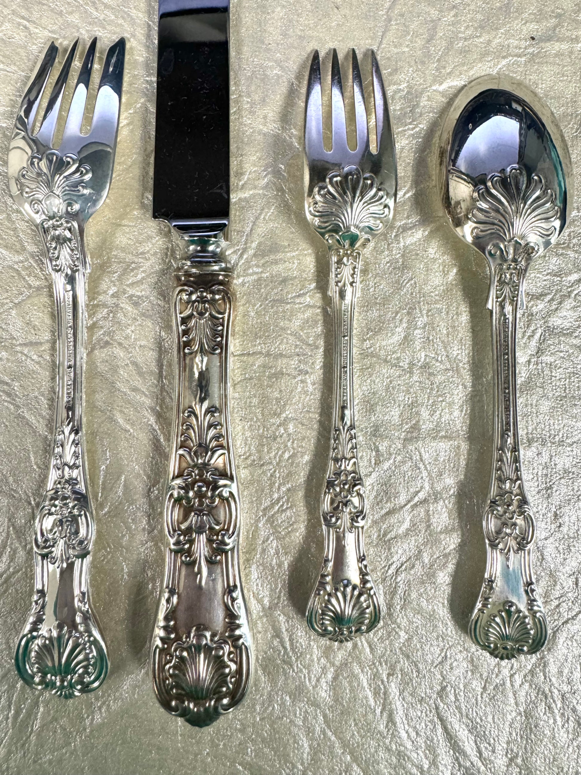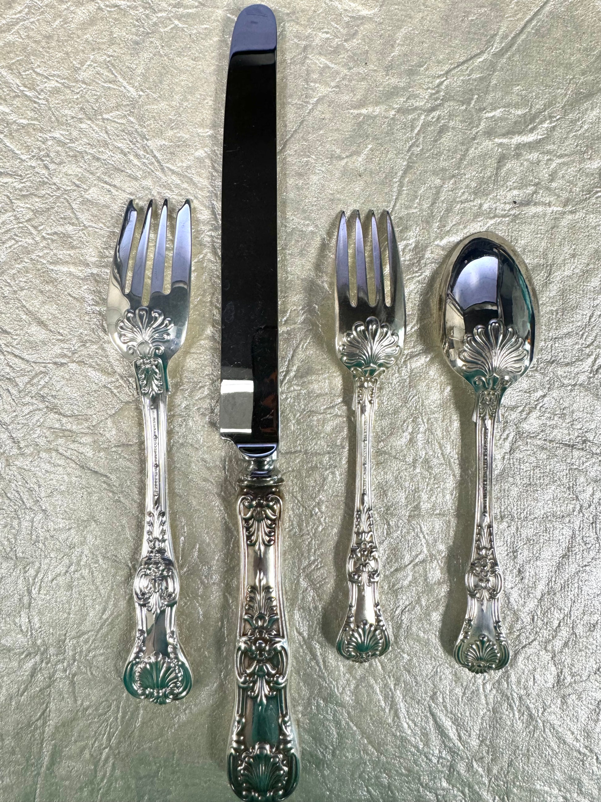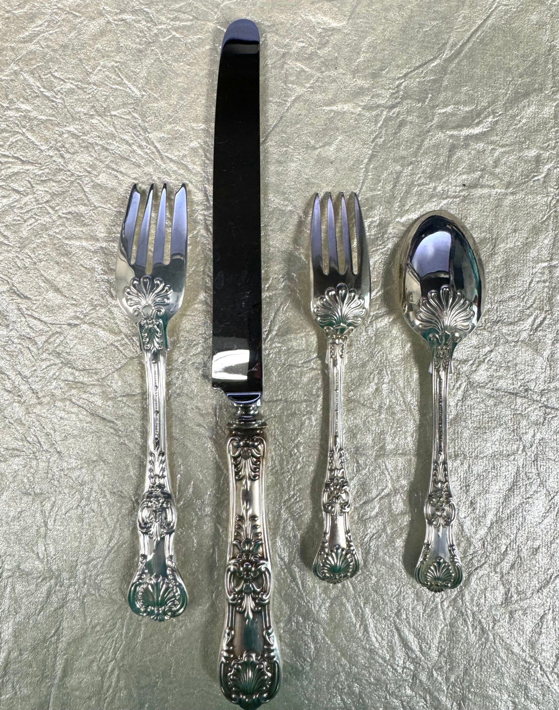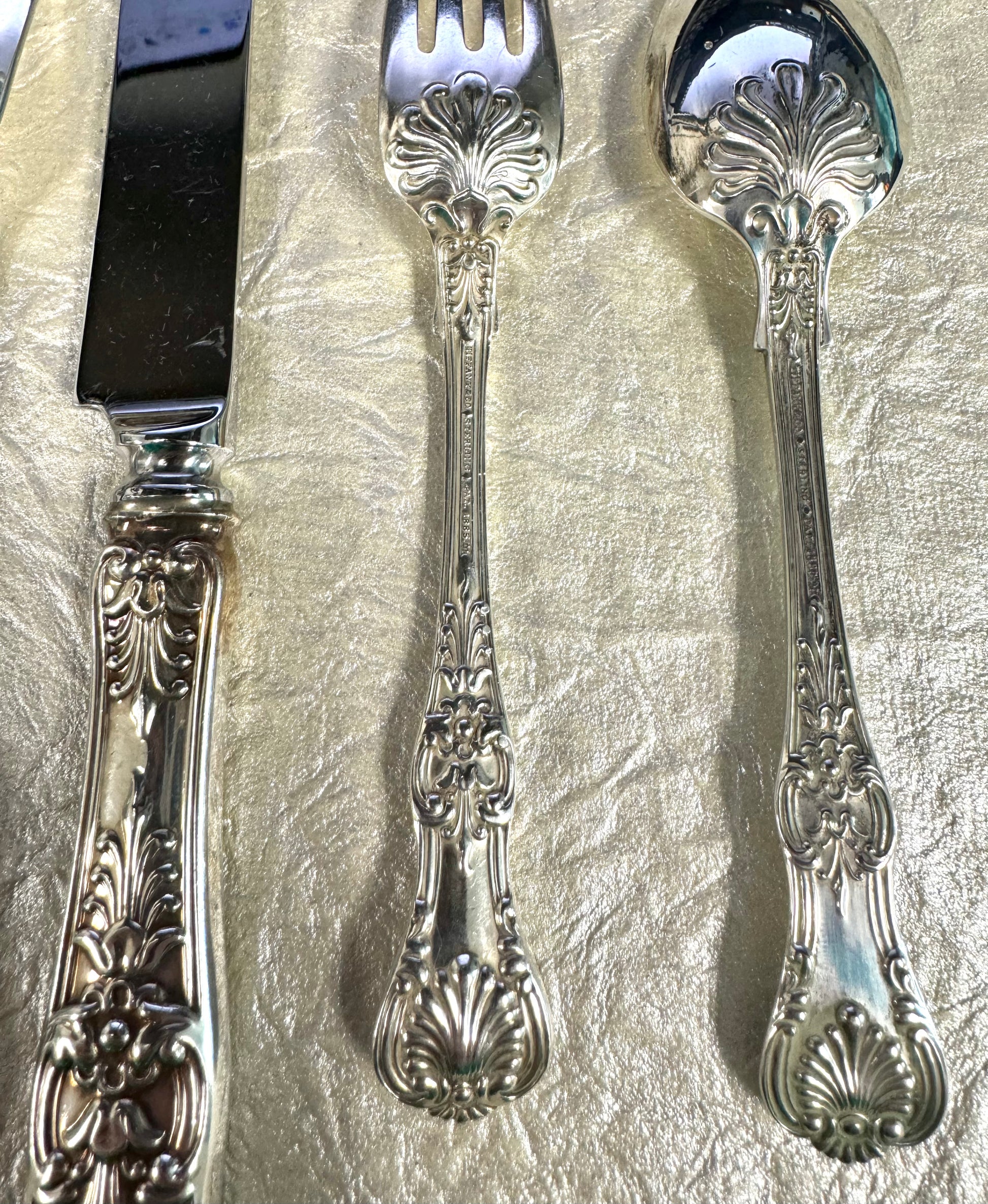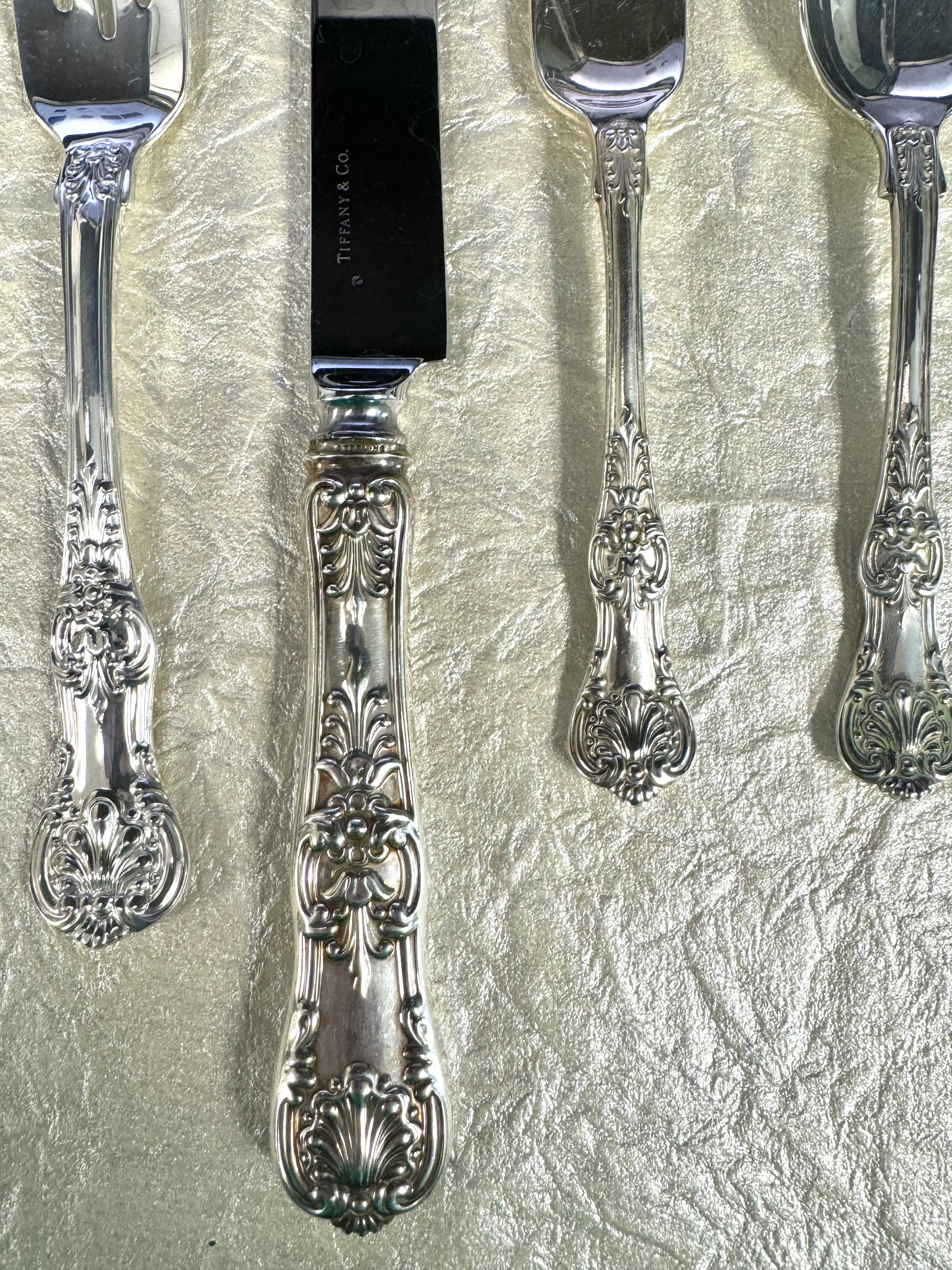 Tiffany’s interpretation of the “King” designs which were popular in England and America in the late 19th century. Considered one of the most elegant patterns the firm produced, Tiffany introduced the design in 1885. This design is a limited edition Tiffany & Co. design and is sold out on their website. Silverware does show signs of use, but is otherwise in good condition. All pieces are hallmarked "TIFFANY & CO, STERLING, PAT 1888" and come with Tiffany & Co. Dust bags.